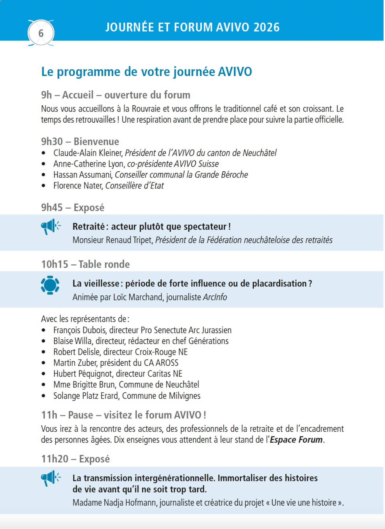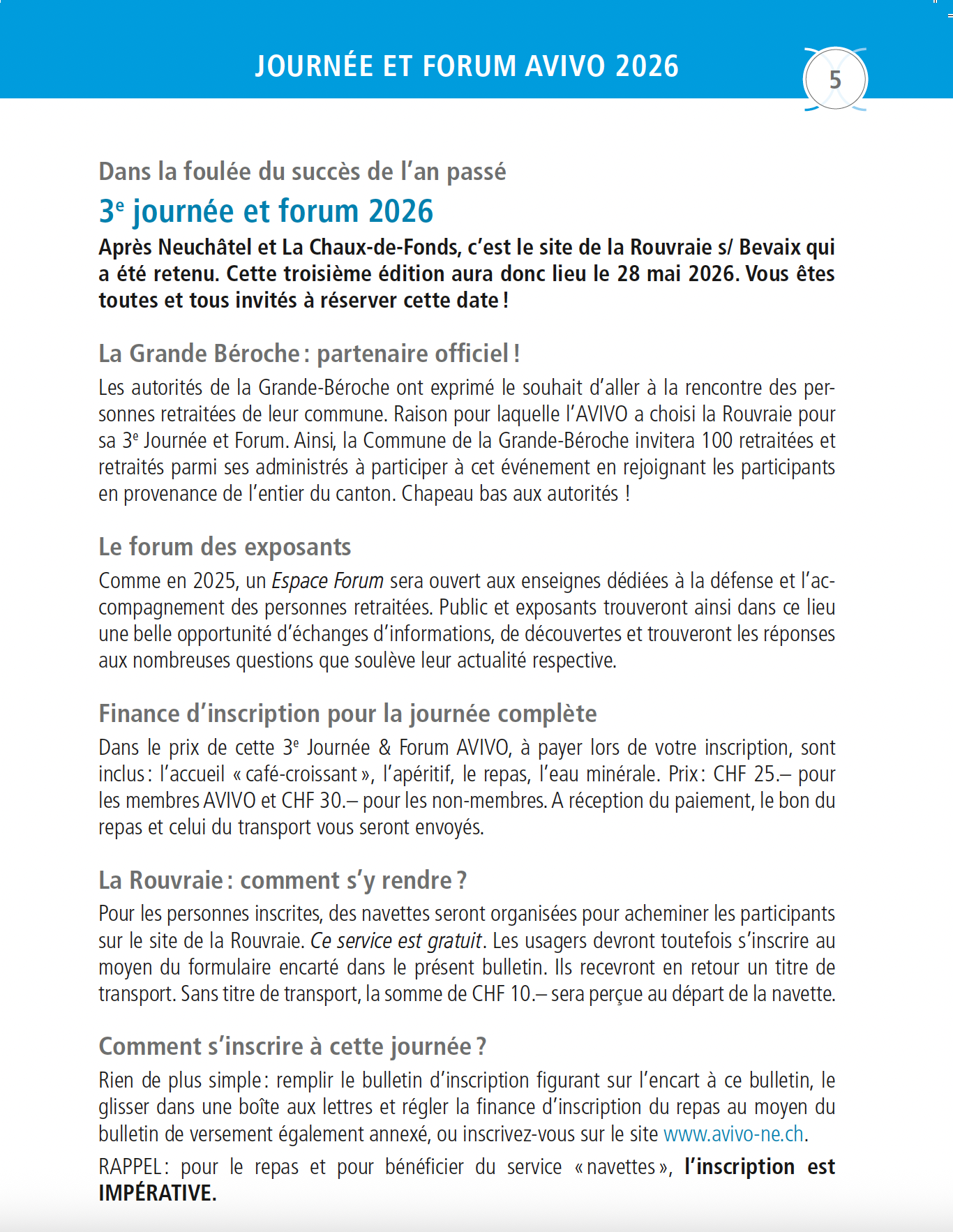 Neuchâtel, le 9 février 2026 : Le 28 mai prochain, toutes les sections de l’AVIVO Neuchâtel se dirigeront sur le site de la Rouvraie au-dessus de Bevaix, pour participer à la troisième édition de leur « Journée & Forum AVIVO» . Au fil du temps, ce rendez-vous gagne en popularité et s’inscrit désormais dans le calendrier des événements dédiés à celles et ceux dont la retraite constitue le quotidien, voire une proche échéance.